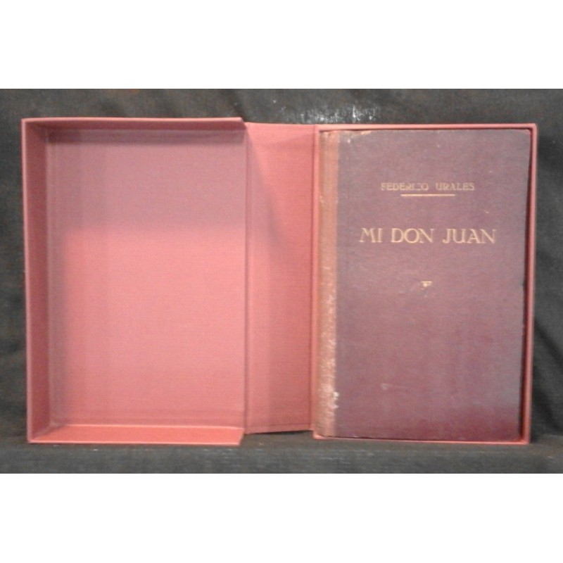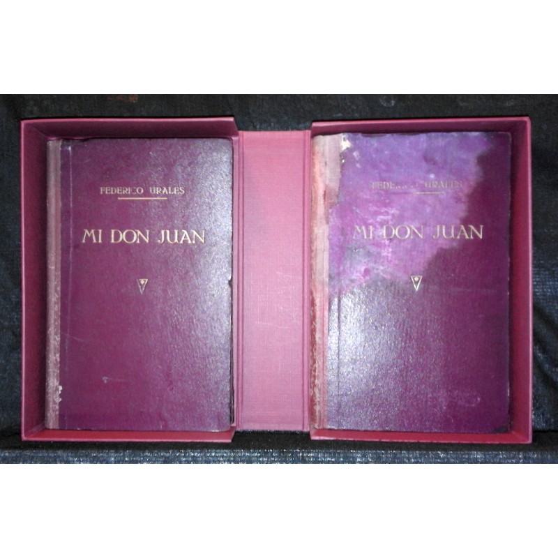 Federico Urales, 1864-1942 . Seudónimo del intelectual anarquiata Joan Montseny, padre de Federica Montseny. Mi Don Juan : novela sobre la vida de un extraordinario amador de mujeres, con todas la aventuras y las luchas a que ello da lugar / Federico Urales Barcelona : Ed. de la Revista Blanca,1936- 1937 198 p. y 208 p. ; 2 volúmenes (falta el 3º) Encuadernación de piel granate a la holandesa Rasguño y humedad en la tapa del segundo volumen. Ejemplar protegido en caja.