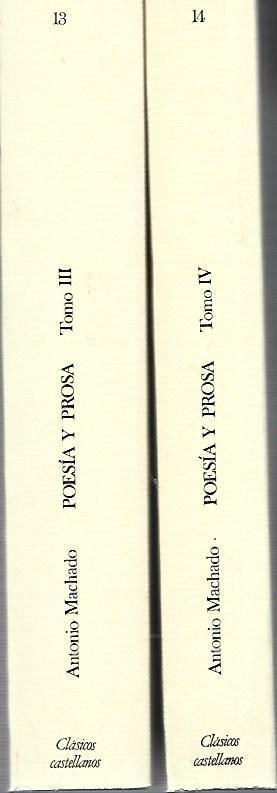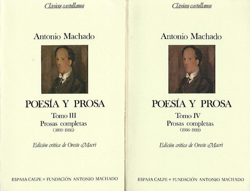 Edición crítica de Oreste Macrí; con la Colaboración de Gaetano Chiappini Madrid: Espasa-Calpe, 1989 2 v .; 20 x 13 cm Se trata de los últimos dos volúmenes de 'Poesía y prosa' completas de Machado. Contiene: V.3. Prosas completas (1893-1936) - V.4. Prosas completas (1936-1939).