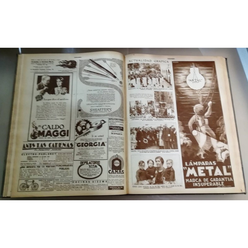 Incluye 8 revistas de los años detallados a continuación. Revistas del 4 y 16 de septiembre; del 9, 16 y 23 de octubre; del 20 de noviembre y del 25 de diciembre, todas de 1928. Revista del 11 de junio de 1929. 48 páginas cada revista aproximadamente. Encuadernación en tela (37x28). Ed. Suc. de Rivadeneyra, Madrid 1928-1929. Páginas con manchas de óxido y tapas ligeramente desgastadas.