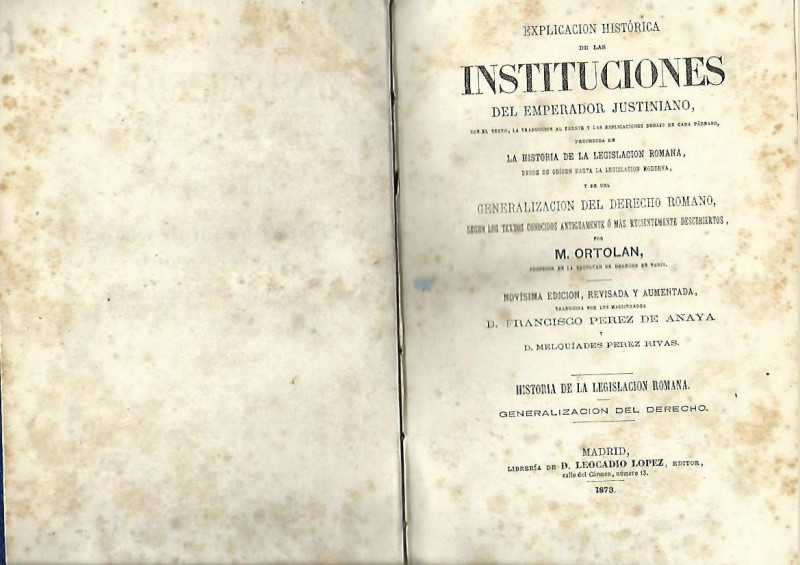 Libro de ocasión editado en Madrid en el año 1873 con 519 páginas mas 138 del apartado sobre Generalización del derecho romano. Encuadernado en telam con piel y dorados en el lomo. Manchas de óxido en algunas páginas. 22x16x4. Peso:
