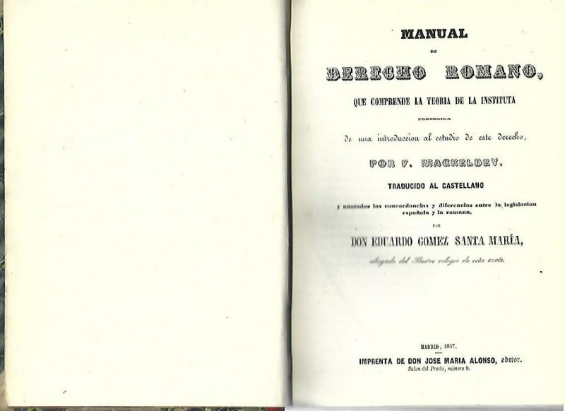 Manual de derecho romano que comprende la teoria de la Instituta, precedida de una introducción al estudio de este derecho. Traducido al castellano y anotadas las concordancias y diferencias entre la legislacion española y romana por Don eduardo Gomez Santa Maria. abogado del Ilustre colegio de esta corte.