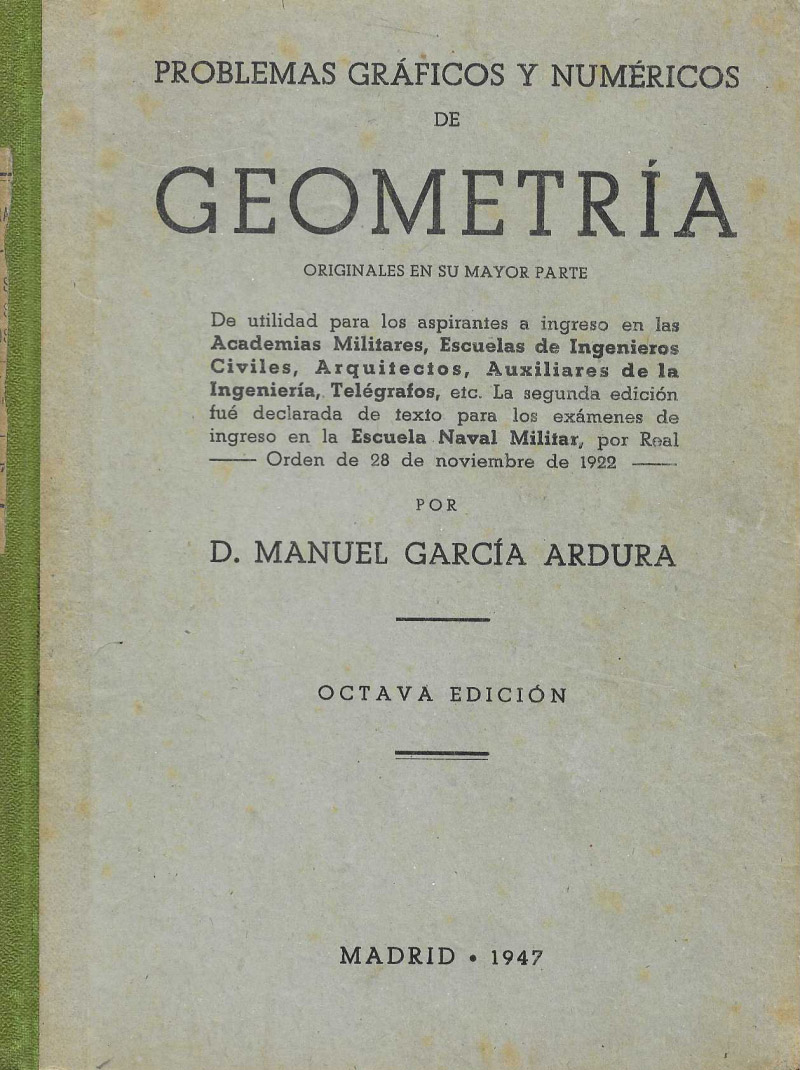 Libro publicado en Madrid el año 1947, de utilidad pra los aspirantes a ingreso en las Academias Militares, Escuelas de Ingenieros Civiles, Arquitectos, Auxiliares de la Ingeniería, Telégrafos, etc. La segundo edición fué declarada de texto para los exámenes de ingreso de la Esculea Naval Militar, por Real Orden de 28 de noviembre de 1922.