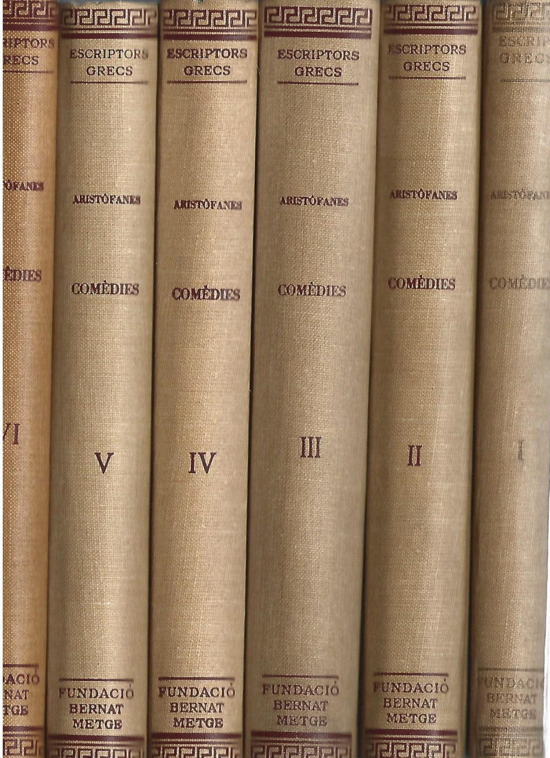 Vol. I: ELS ACERNESOS. Vol. II: ELS CAVALLERS. LES BROMES. Vol. III: LES VESPES. LA PAU. Vol. IV: ELS OCELLS. LISITRATA. Vol. V: LES TESMOFORIES. LES GRANOTES. Vol. VI: LES ASSEMBLEISTES. PLUTUS.