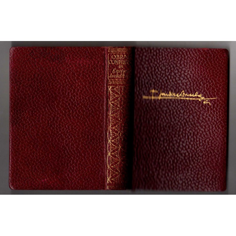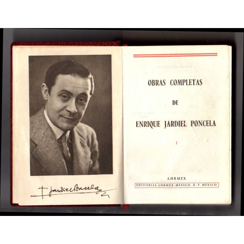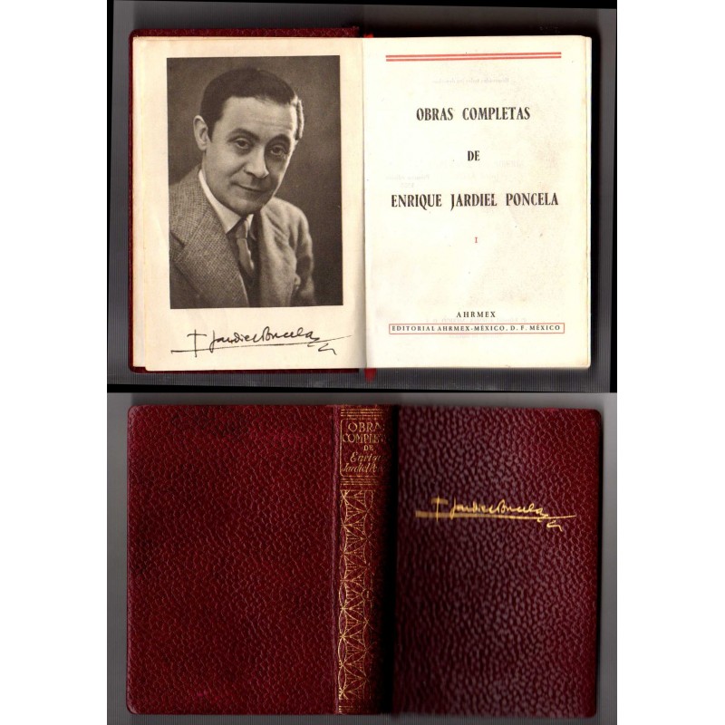 Jardiel Poncela, Enrique, 1901-1952. Edición: 1. ed. Méjico: AHRmex, 1958. 1508 p. 18 cm x 13cm 1 volúmenes de los 3 de la obra completa. Con ilustraciones intercaladas y en plena página. Registro de seda roja. Encuadernación en piel de grano largo, color burdeos. Lomo ornamentado con tracerías en técnica dorada que forman motivos florales. Cortes superiores de las páginas dorados. Cañuela interior (visagra de la contratapa y el cuerpo del libro) deteriorada. Obras: Amor se escribe sin hache ¿Pero hubo alguna vez 11000 vírgenes? La tournée de Dios Espérame en Siberia Vida mía